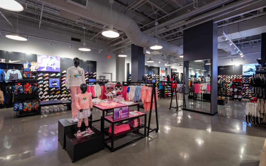 Expanding the existing Foot Locker into two adjacent tenant spaces required demolishing walls and leveling the floor down to the slab. Despite the scope of demolition posing potential delays, Connor Construction’s team worked diligently to stay on schedule. Once we had a blank canvas, we installed a cohesive lighting grid, framed and finished carpentry, and installed signage for both the interior and storefront. Foot Locker’s new store prototypes emphasize clean polished floors and ample lighting, ensuring customers can view shoes and apparel as they would on or off the court.
